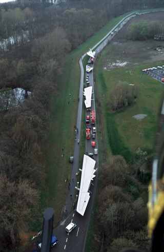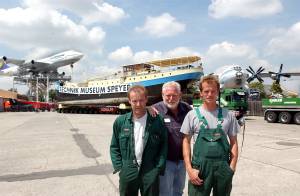 Am Freitag, 22. März 2002, sind die Tragflächen und das Heckleitwerk in Speyer per Ponton eingetroffen und per Tieflader erfolgreich ins Technik Museum Speyer gebracht worden. Am Sonntag wurde der riesige Rumpf des Flugzeuges transportiert. | |||||||||||||||||||||||||||||||||||||||||||||||||||||||||||||||||||||||||||||||||||